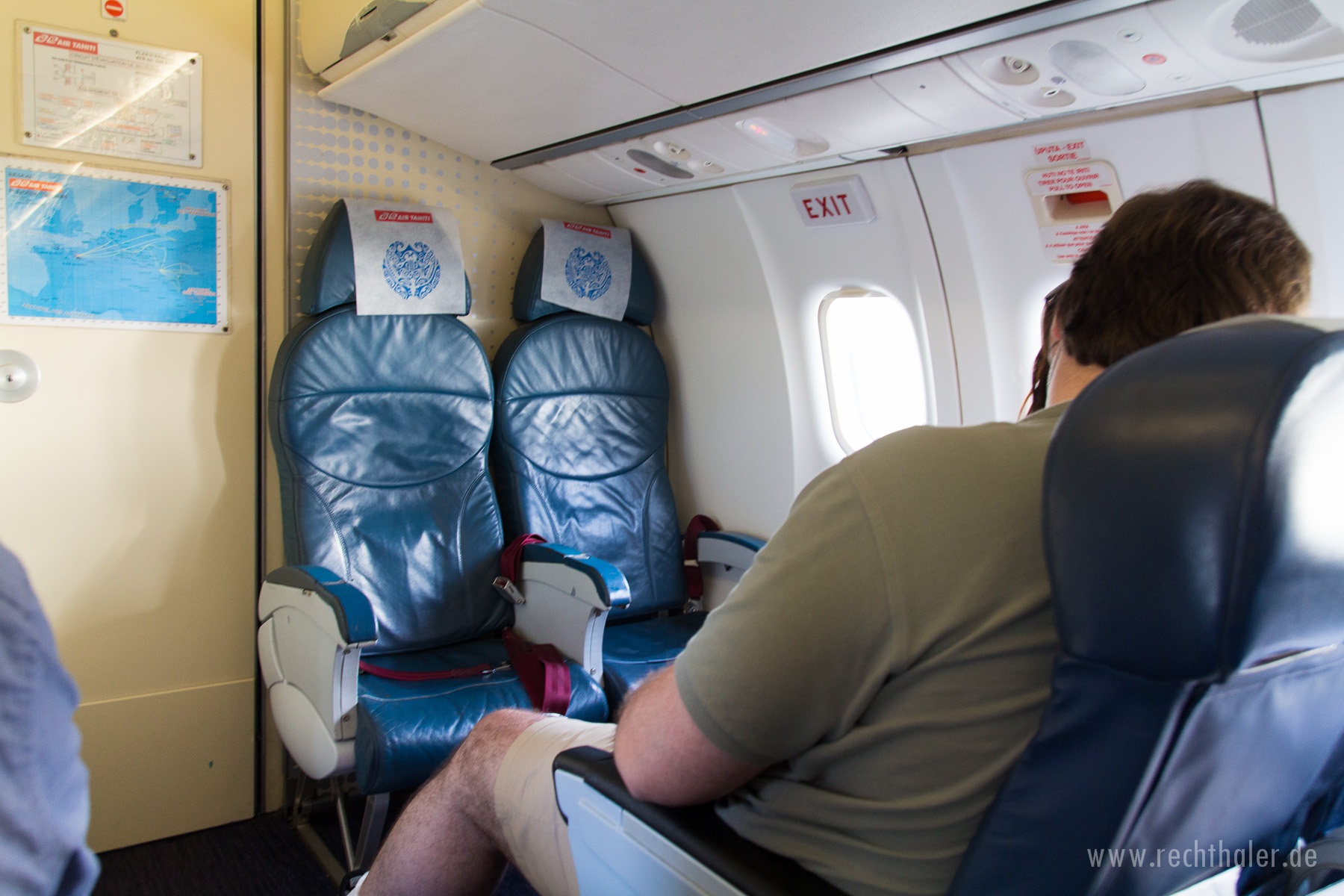 Im Flieger ist freie Platzwahl, was mich dazu veranlasst hat möglichst weit nach vorne zu sitzen um den Abgasen der Propellermotoren aus dem Weg zu gehen. Diese verwischen den Blick aus dem Fenster zusätzlich und es gibt gar keine Möglichkeit für ein Foto aus der Luft.