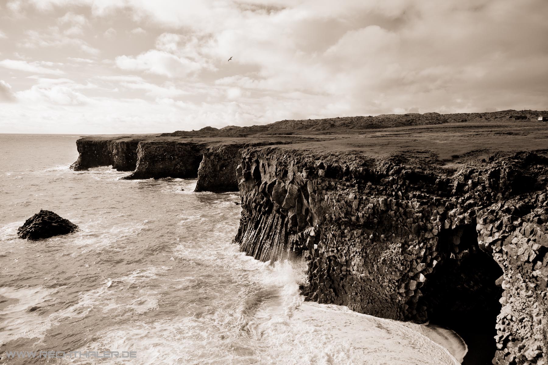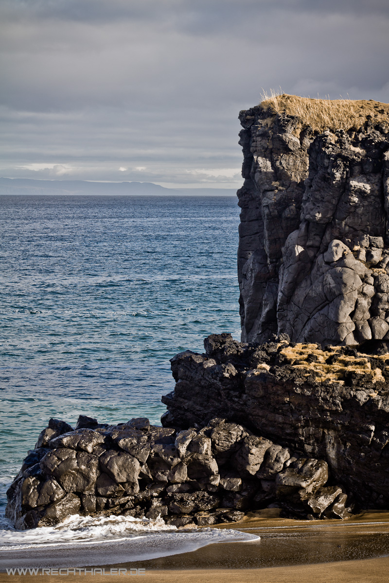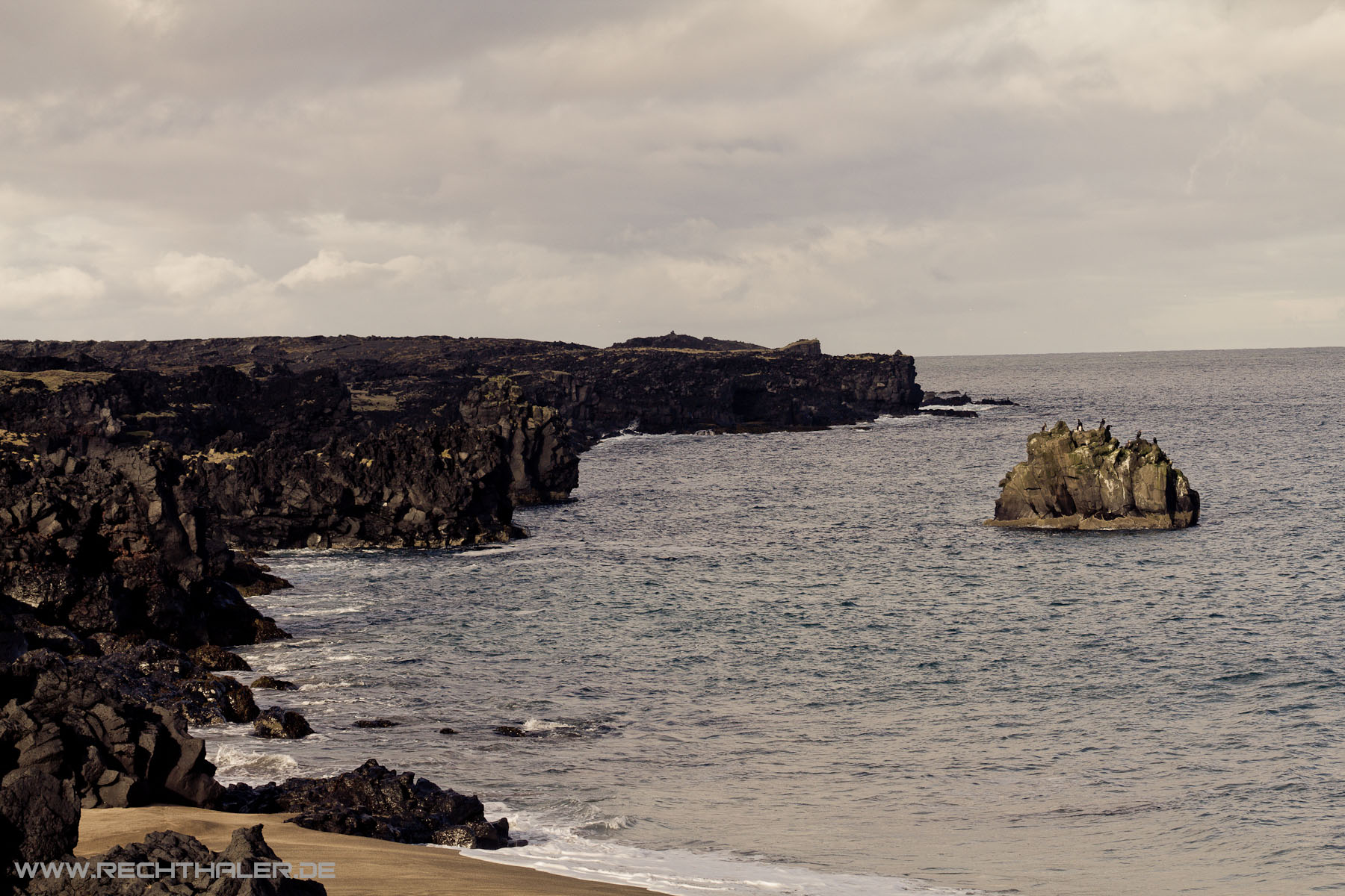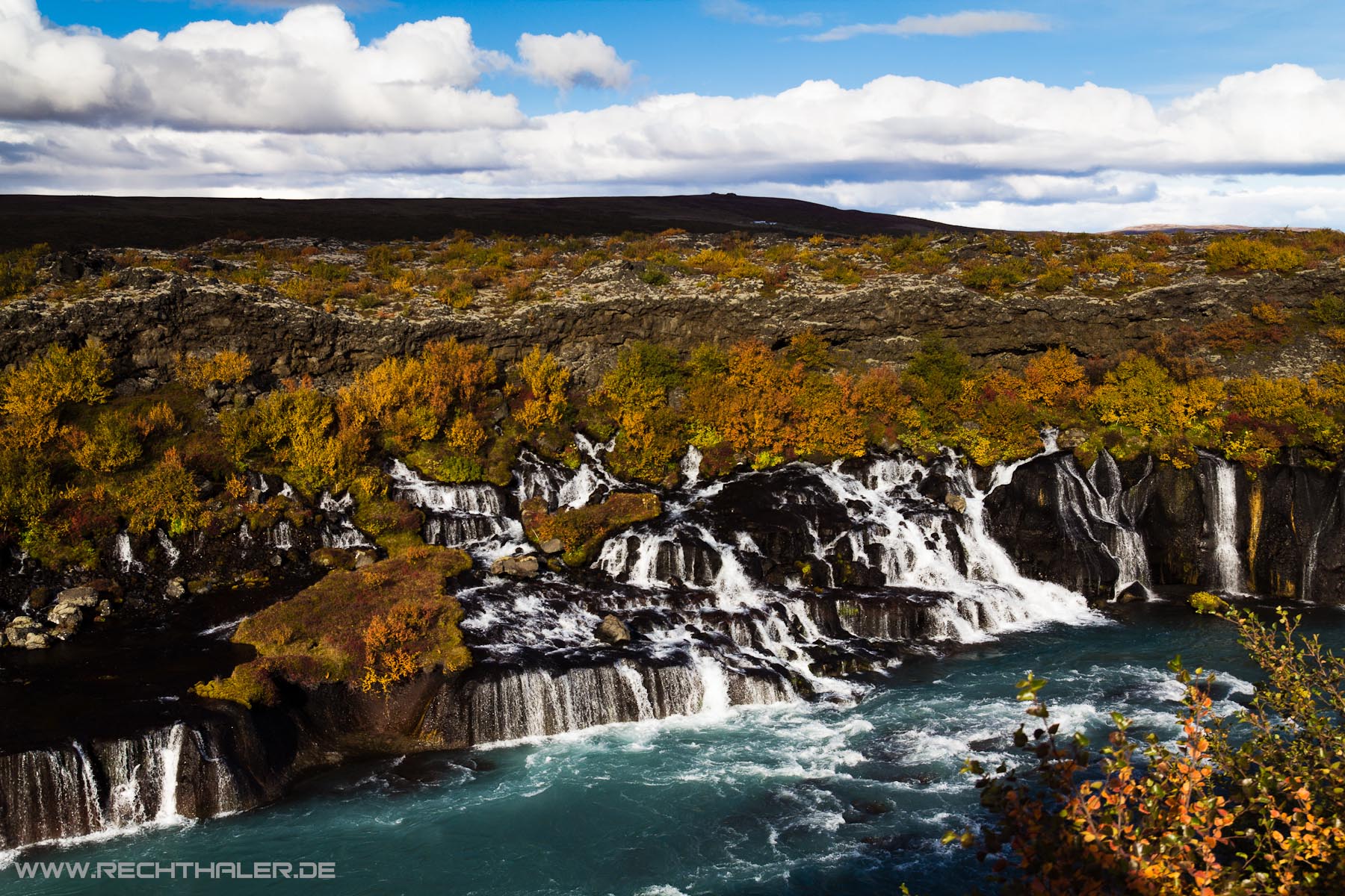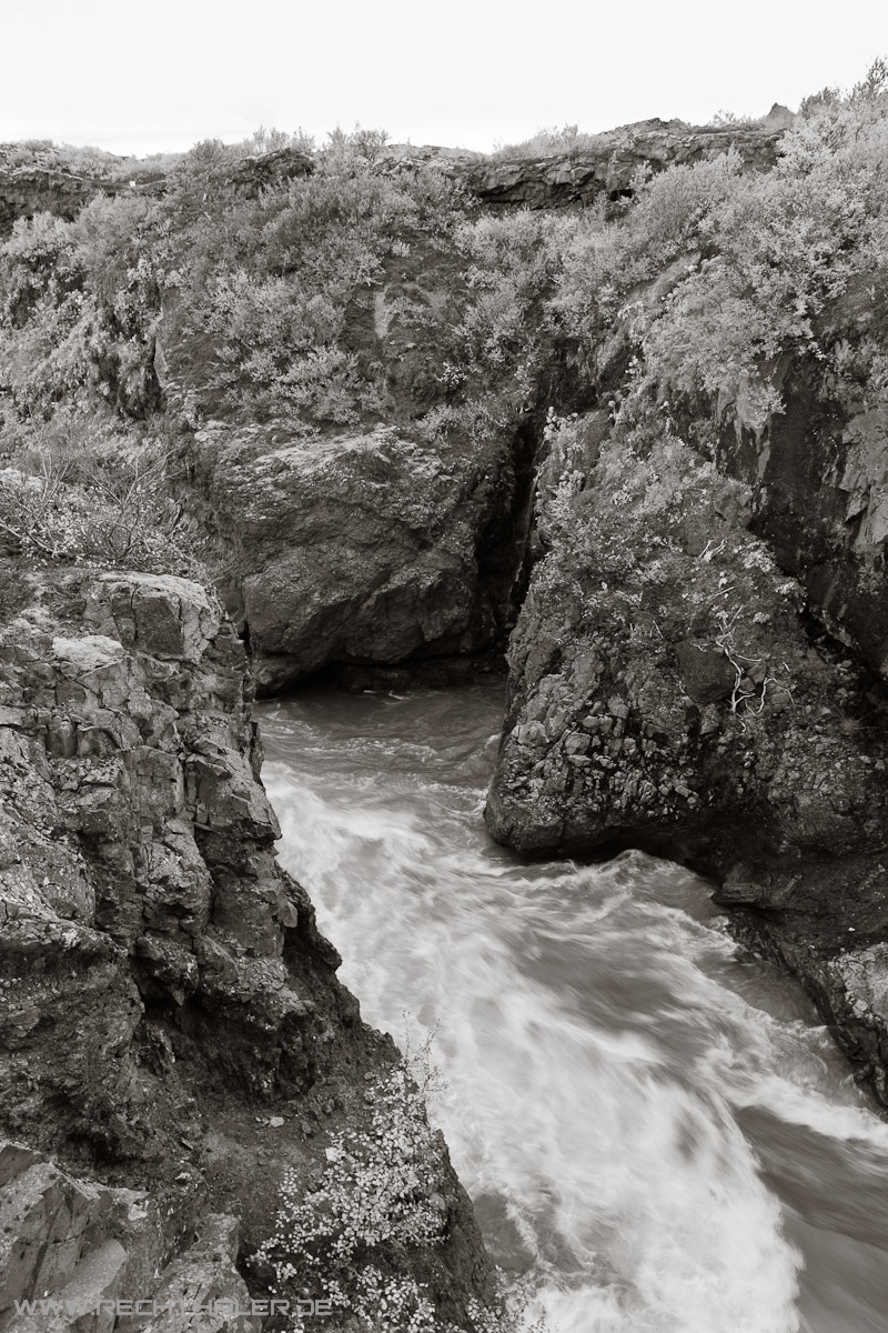 Von Grundafjordur aus starteten wir die Umrandung der Snæfellsness Halbinsel und erhofften uns einen Blick auf den Gletscher Snæfellsjökull, der sich aber den ganzen Tag in dichten Wolken versteckte. Dementsprechend verlief die Fahrt ohne große Höhepunkte und mit den üblichen kurzen Stopps für nette Küstenabschnitte, Felsen oder Leuchttürme. Bereits gegen 15 Uhr trafen wir am nächsten Übernachtungspunkt ein, der nur noch 70km nördlich von Reykjavik lag. Für den nächsten Tag standen noch zwei Wasserfälle auf dem Programm, die von ihrer Art ganz anders sein sollten als die bisherigen. Da sie nur etwa 1 Stunde entfernt waren beschlossen wir, diesen Punkt am gleiche Tag noch zu erledigen anstelle den halben Nachmittag im Gasthaus zu verbringen. Die Wasserfälle waren wirklich sehr schön und anders. Beim Hraunfossar tritt auf einer Länge von 700 Metern Wasser aus einer Lavaschicht aus, die dann über die gesamte Breite in einen Fluss hinab fällt. Der benachbarte Barnafoss ist eigentlich kein Wasserfall im klassischen Sinn. Hier werden die Wassermassen mit einer sehr hohen Geschwindigkeit durch eine enge Stelle in der Schlucht gedrückt, wodurch starke Stromschnellen entstehen. Ein interessanter Anblick und im Sommer sicher ein Touristenmagnet, den wir befanden sich sogar Verkaufsstände und Toiletten.