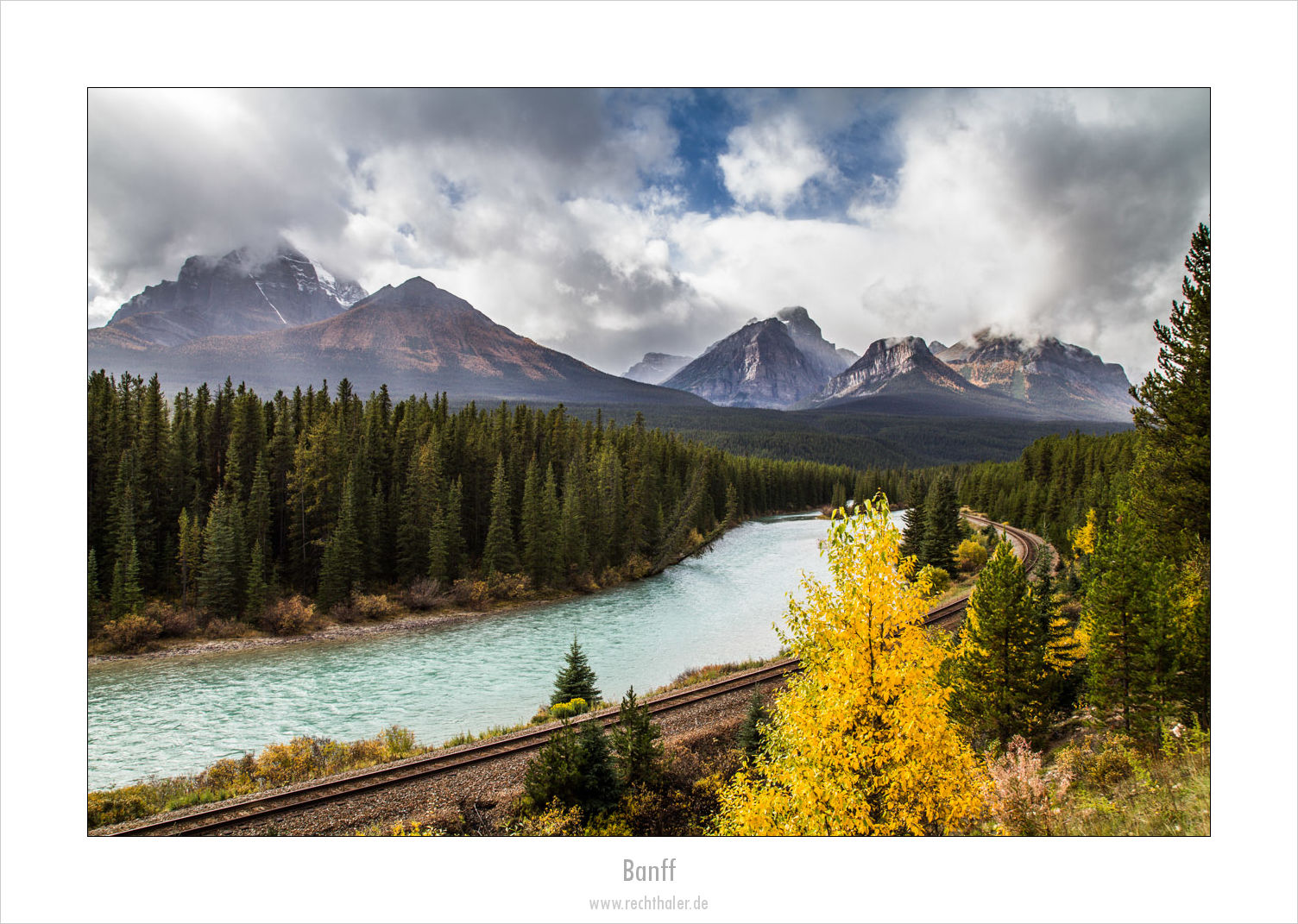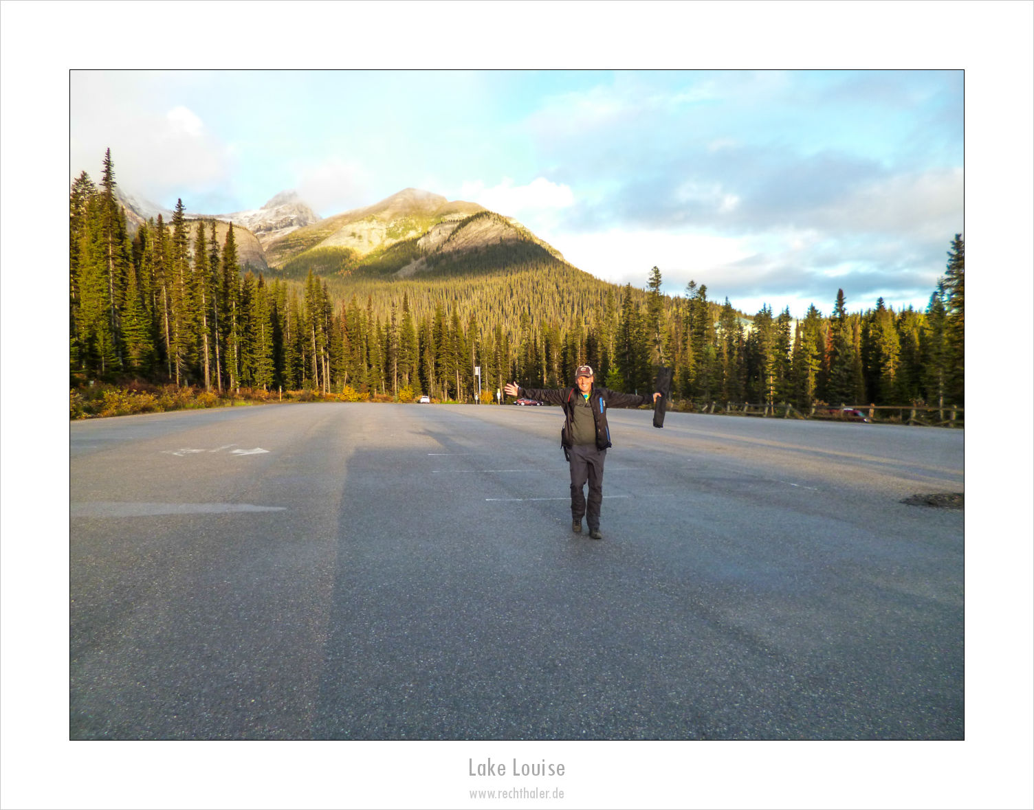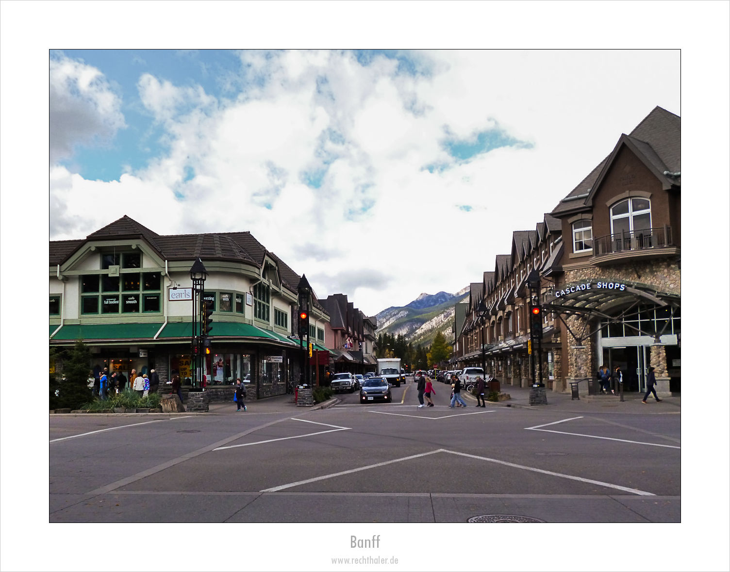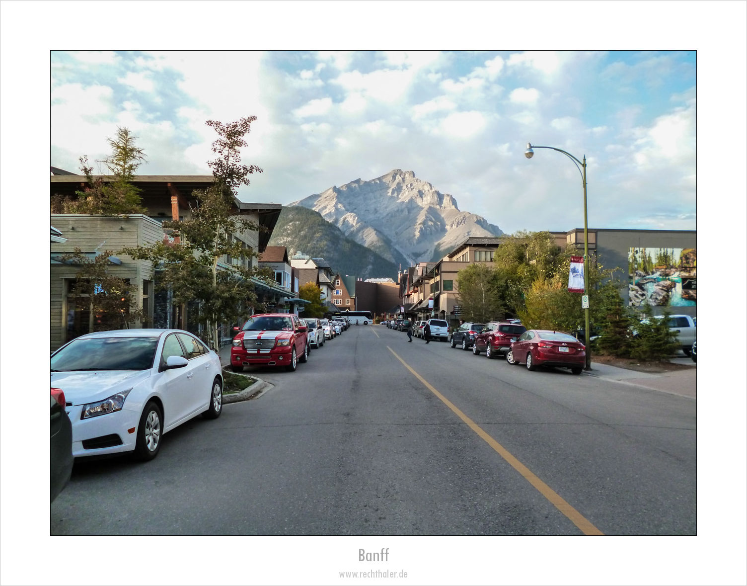 Die Nacht war laut und unruhig. Als wir aufgewacht sind hat es geregnet. Wir haben in aller Ruhe Körperpflege betrieben und sind ohne Frühstück um elf Richtung Banff gefahren, weil es bei der Nebelsuppe keinen Sinn macht zu den umliegenden Seen zu fahren. Die Fahrt dauert ca. eine Stunde. In Banff haben wir direkt an der Touristeninfo gehalten, um Infos über Trails und Alternativen zum Tunnel Campingplatz einzuholen. Die Frau am Infoschalter war sehr gut informiert und sehr nett. Sie hat uns ausführlich alle Möglichkeiten beschrieben und Insidertipps dazu gegeben.