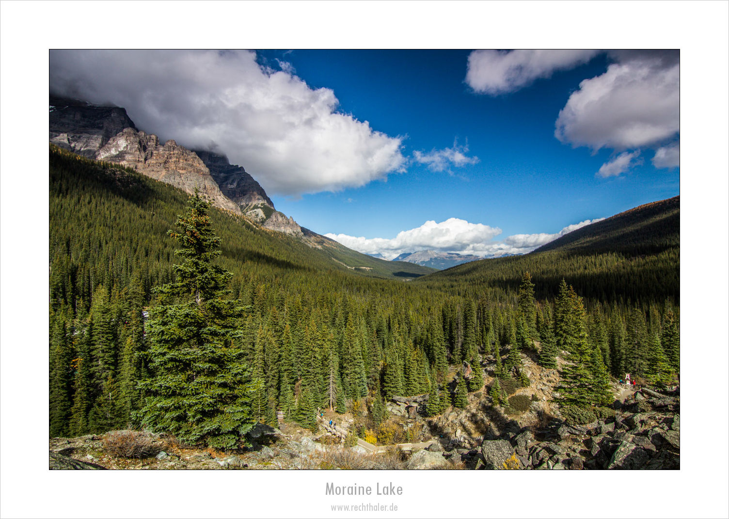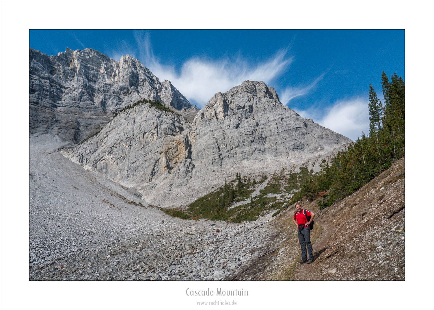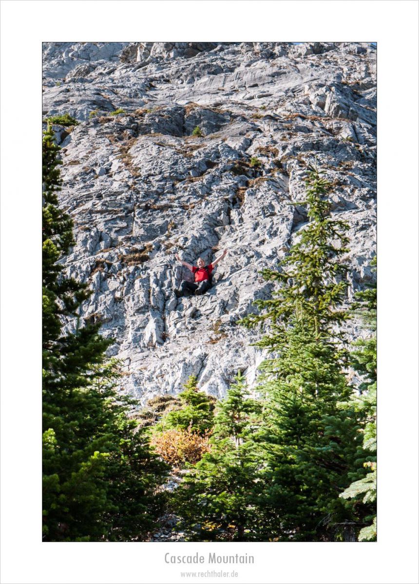 Schon hier überlegten wir uns, ob es sich wohl lohnt weiter hoch zu laufen, oder ob uns das schon anstrengend genug war. Schließlich sagten wir, dass wir zum Wandern da sind und sind weiter gelaufen. Es ging noch weiter 1,5 Stunden bergauf, durch eine wenig abwechslungsreiche Landschaft. Als wir auf einer Anhöhe kurz Rast machten, kam gerade ein junges deutsches Pärchen vom Geröllfeld herunter. Die waren doch tatsächlich bis zur oberen Baumgrenze gelaufen. Kurz haben wir kritisch das Geröllfeld und den Berg angeschaut, sind dann aber doch wild entschlossen los marschiert. Ich weiß nicht, wie oft ich geflucht habe. Julia fand es augenscheinlich mindestens genauso anstrengend (so ließ zumindest ihr roter Kopf vermuten), sie fand es aber mal wieder schön, so durch die Wildnis zu stapfen. Nach brutal anstrengenden 45 Minuten waren wir endlich oben angekommen! Und es war herrlich! Mein Jodler hallte fünfmal nach und die Aussicht war bombastisch! Es hat sich wirklich gelohnt, sich hier rauf zu quälen. Man hat Blick auf eine wunderschöne Bergkulisse, den Lake Minnewanka und den kleineren Johnson Lake. Wir genossen den Anblick hier oben bestimmt eine dreiviertel Stunde aus allen möglichen Perspektiven. Unter anderem sind wir die Felswand hoch gekrakselt und hingen dann im Stein, so dass die Amerikanerinnen, die gerade auch angekommen waren, sagten, wir sähen aus wie eine Schnitzerei in einer alten gotischen Kirche.