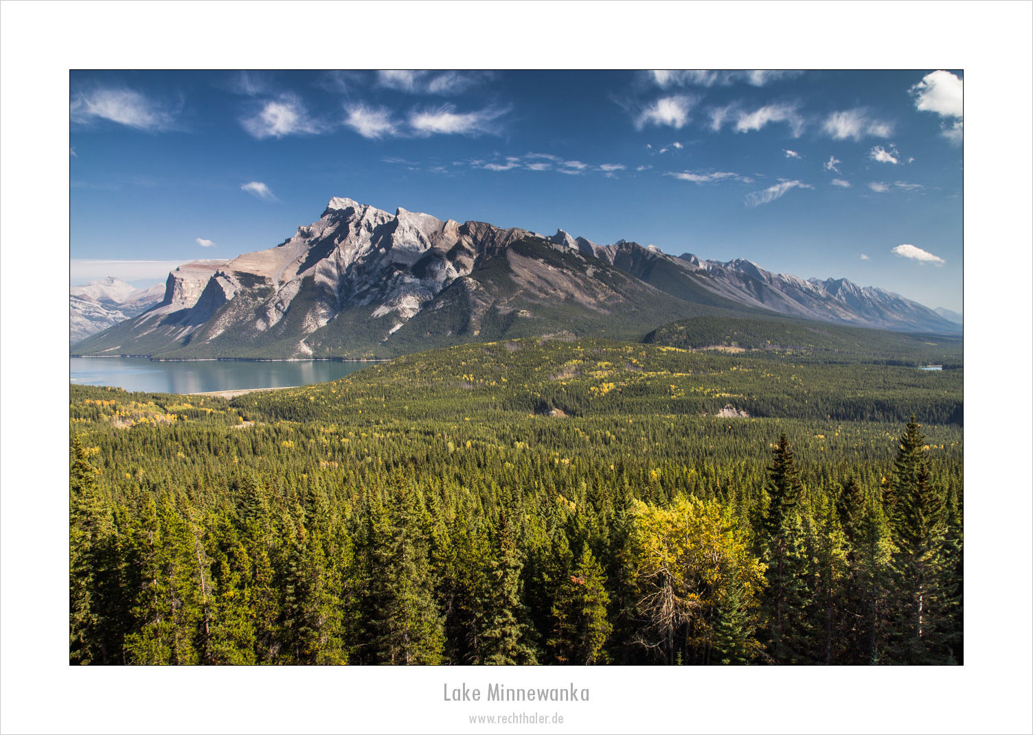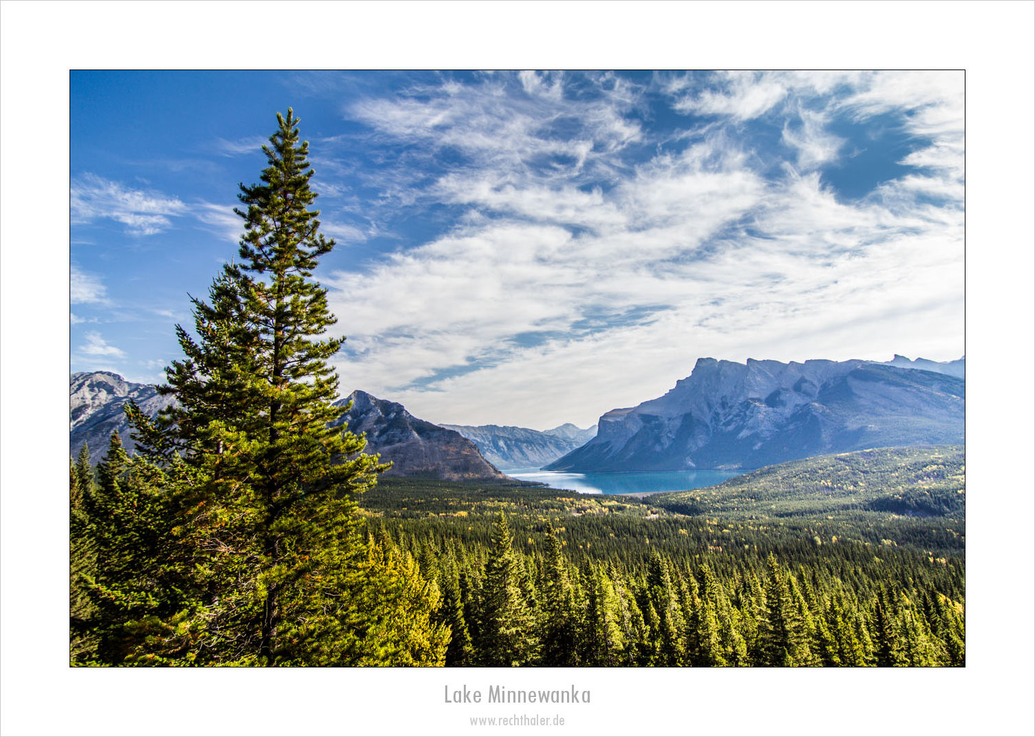 Wir fuhren zum Upper Bankhead. Der 8,4 km lange Trail C-Level Cirque beginnt ziemlich steil bergauf. Nach ca. einer halben Stunde strammen bergaufgehens kam die Betonhütte, von der die Dame im Visitor Center sprach. Hier sollten wir vom Trail herunter, hinter der Hütte vorbei gehen, dann würden wir zu einem schönen Aussichtspunkt kommen. Der Tipp war wirklich gut, wir hatten einen wunderschönen Blick auf den Lake Minnewanka und die umliegenden Berge.