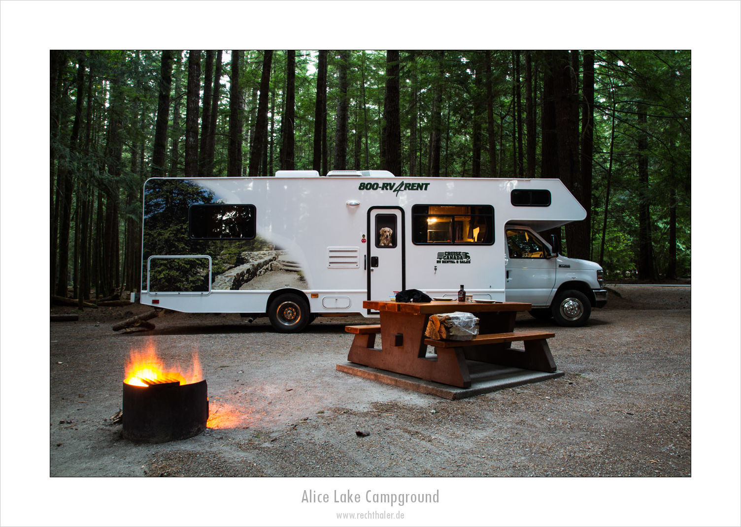 Auf der Fähre haben wir dann wieder das deutsche Pärchen vom Vorabend getroffen und sind ins Gespräch gekommen. Die Fährfahrt war ruhig und wir genossen die Sonne auf dem Sonnendeck. Um zwei Uhr legten wir in Horseshoe Bay an. Direkt nach der Ausfahrt war ein völlig unnötiger Stau wegen irgendwelchen Dreharbeiten, die aber wenig wichtig aussahen. Wir fuhren ca. eine Stunde nach Squamisch, wo ein kleiner Provincial Parc sein soll zum Adler beobachten. Wir haben nirgends ein Schild oder eine Einfahrt gefunden, also haben wir kurzerhand in einem Coffeeshop gefragt. Die Dame sagte uns den Weg, meinte aber auch, dass wir keine Adler sehen werden, da sie erst im Winter kommen würden. So war es dann auch. Allerdings sind wir nicht sicher, ob wir auch tatsächlich in diesem Park waren oder einfach in irgendeinem Wald.  Nach einer guten Stunde planlosem umherirren haben wir aufgegeben und nach einem Campingplatz gesucht. Wir entschieden uns für einen Platz ohne Service im Wald. Er heißt Alice Lake und hat 30$ gekostet. Er war sehr schön an einem kleinen See mit Strand gelegen, hat an jedem Stellplatz Tisch, Bank und Feuerstelle. Die Sanitären Einrichtungen sind allerdings nicht besonders erwähnenswert. Da es noch nicht so spät war haben wir auf dem Rückweg vom See beschlossen Holz zu sammeln (das hier in rauen Mengen rumliegt) und ein BBQ zu machen. Als wir zurück waren kam auch schon der Ranger um die Parkgebühr zu kassieren. Schnell versteckten wir unser gesammeltes Holz und kauften noch ein Säckchen für 8$, weil gerade in diesem Moment ein Typ mit gesammeltem Holz an uns vorbei lief, der dann von der Rangerin einen Anschiss kassierte und die Ankündigung des Parkverbots wenn er es anzünden würde. In Kanada ist es strengstens verboten Holz für Lagerfeuer zu sammeln, da dadurch Lebensräume zerstört werden. So ein Quatsch! Wir haben nur ein bisschen aufgeräumt. Das gekaufte Holz haben wir als Alibi gut sichtbar auf den Tisch gelegt und dann das gesammelte verfeuert. Wir haben uns ein leckeres Abendessen gemacht mit Steaks vom Angusrind, Folienkartoffeln und Coleslaw.  Die Deutschen vom Tag zuvor standen auch wieder neben uns und wir luden sie ein zu uns herüber zu kommen. Es war ein netter und unterhaltsamer Abend.