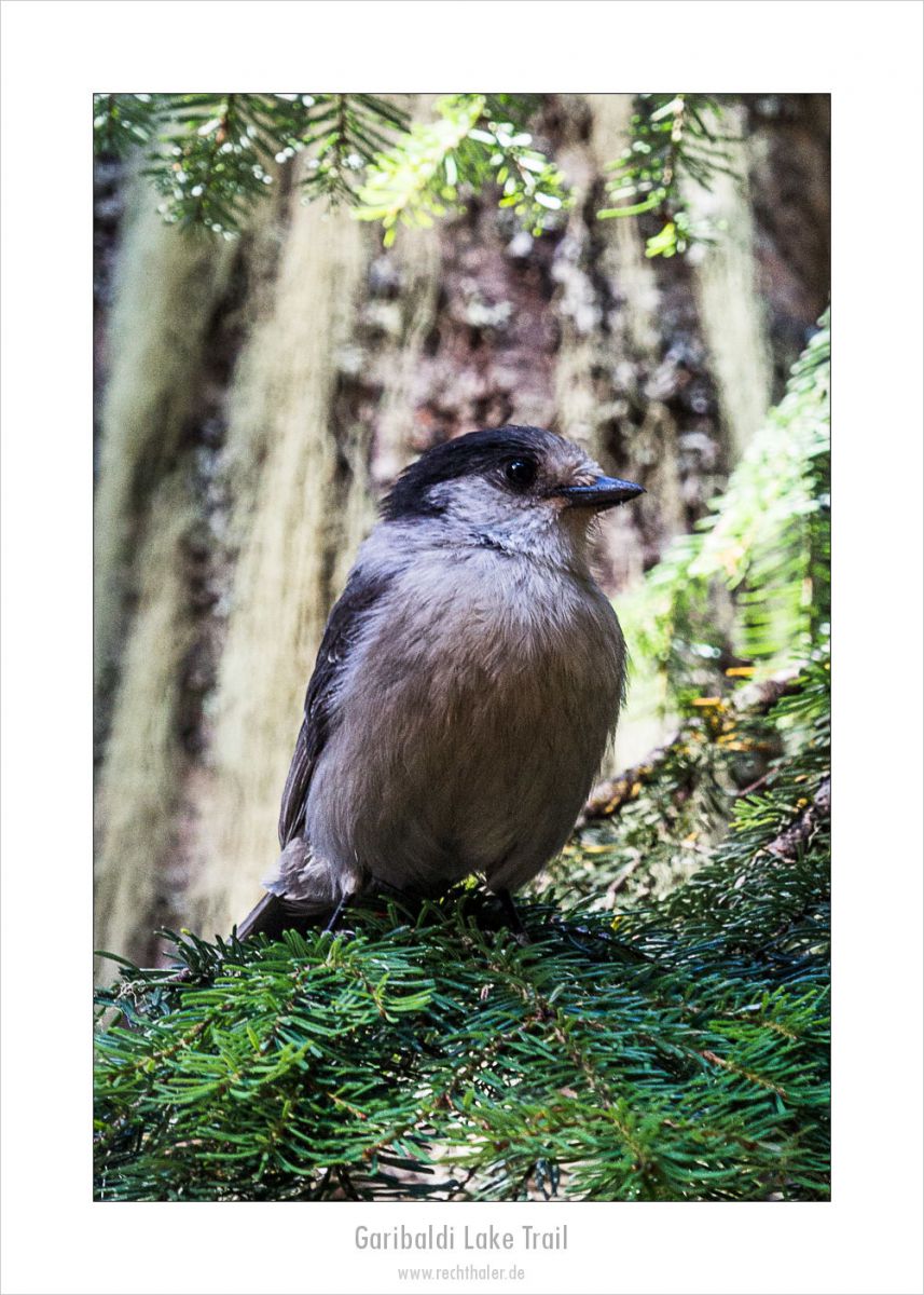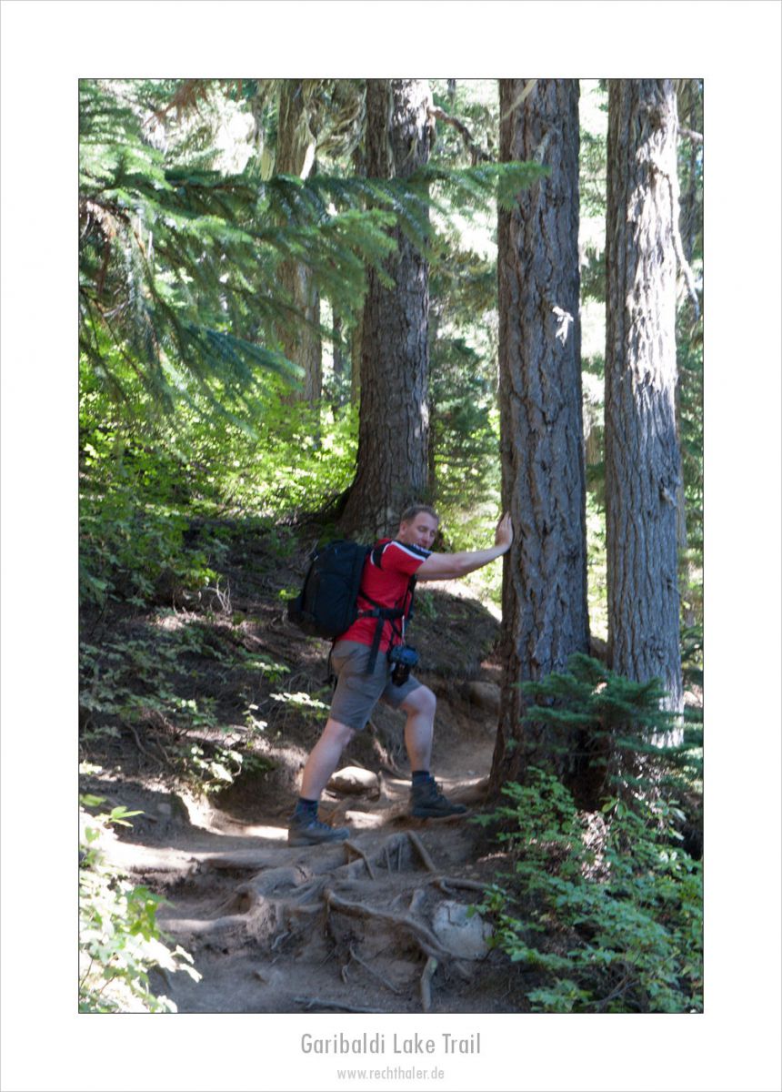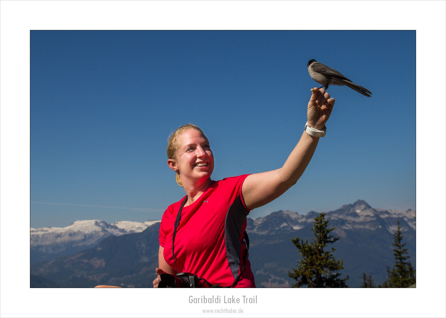 Um halb neun sind wir aufgestanden und haben lecker gefrühstückt (mit Kaba von Dolorama für 1$). Mit etwas Verspätung sind wir um 9:15 los gefahren in Richtung Lake Garibaldi. Mal wieder haben wir die Ausfahrt verpasst weil wir kein Schild gesehen haben. Die Strecke, die wir uns für den heutigen Tag raus gesucht hatten beträgt 18km. Um 10:15 sind wir los gelaufen. Es ging vier Stunden nur steil bergauf durch einen recht unspektakulären Wald. Da heißt es wirklich nur Zähne zusammenbeißen und durchhalten! Nach 6,5km kommt mal ein Aussichtspunkt. Man hat von dort aus Blick auf die Berge und im Rücken eine steile Steinkante. Das ist quasi die Wand des Lake Garibaldi. Im Tal muss einst ein Dorf gewesen sein, das evakuiert wurde. Vor 10 000 Jahren war dort ein Gletscher  und ein Vulkan. Als der Vulkan ausbrach konnte die Lava wegen des Gletschers nicht weiter und verglühte dort. Heute wirkt das Ganze als Staudamm für den Lake Garibaldi, ist allerdings ziemlich instabil. Wenn man am Aussichtspunkt steht hört man auch ziemlich intensiv Geröll abgehen, was zeitweise schon ein bisschen beängstigend war. Der kleine Zwischenstopp am Aussichtspunkt war dennoch sehr schön, weil wir ein gigantisches Naturerlebnis hatten. Die Tiere dort oben waren so zutraulich, dass ein Vögelchen und ein Streifenhörnchen sich aus der Hand haben füttern lassen.