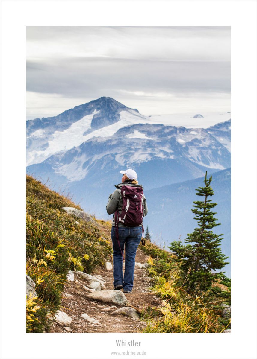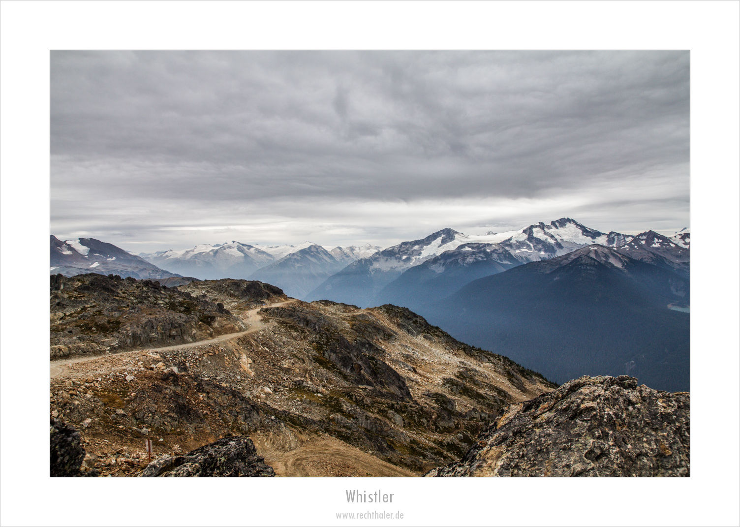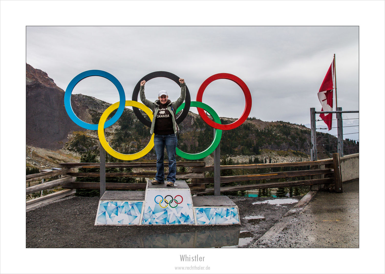 Der Regen wurde nach und nach kräftiger. Dennoch wollten wir zumindest einmal unser Ticket der Peak 2 Peak Gondula nutzen. Diese Gondel (von Doppelmayr gebaut!) ist echt faszinierend! Sie geht vom Whistler Mountain zum Blackcomb Mountain, überquert ein Tal über eine Strecke von 4,4 km komplett ohne Stützpfeiler in über 400 Metern Höhe in elf Minuten. Auf Bildern kann man die gewaltige Höhe gar nicht einfangen. Inzwischen wurde das Wetter immer ungemütlicher und wir waren durchgeschwitzt von der Wanderung und inzwischen durchgefroren, so dass wir eigentlich nur noch unter die warme Dusche und auf die Couch wollten. Also sind wir nur einmal um die Aussichtsplattform am Blackcomb Mountain gelaufen und gleich wieder zurück gefahren. Pünktlich zum nächsten Shuttle waren wir wieder im Tal. Eigentlich wollten wir noch durch das nette Städtchen bummeln und einen heißen Starbuckskaffe genießen, den wir uns gegenseitig während des Trails versprochen hatten. Wir waren aber so fertig, dass wir direkt zu Campingplatz zurück sind. Die heiße Dusche am Campingplatz war traumhaft.