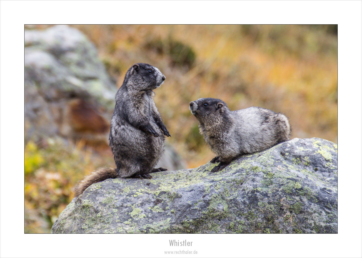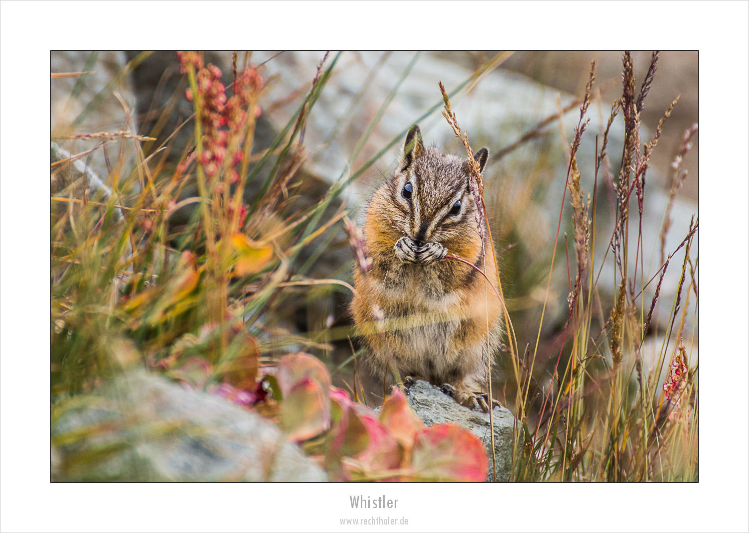 Heute ließ unsere Glücksträhne was Sonnenschein angeht leider massiv nach. Der Himmel war grau in grau und immer wieder regnete es. Von Deutschland aus hatten wir bereits die Gondeltickets gebucht, da es im Internet ein Angebot gab, bei dem man einen zweiten Tag kostenlos hoch fahren darf, wenn man fünf Tage im Voraus bucht. Insofern sind wir trotz schlechter Sicht und Regen zum Gipfel gefahren. Es gibt dort einen kleinen Rundweg mit 2,5km, den high note Trail mit 9,5km und eine Abkürzung vom high note Trail mit gut 6 km. Wir hatten uns den großen high note Trail vorgenommen. Es ging über Sock und Stein. Von dem Gipfelpanorama, das wir uns erhofft hatten hat man aufgrund des Wetters leider nicht viel gesehen. Unterwegs haben wir dafür einige nette Tierchen entdeckt. Die Streifenhörnchen waren hier deutlich scheuer als am Tag zuvor. Eine Besonderheit dieser Region sind die Pikas und Marmots. Zumindest davon haben wir reichlich gute Fotoausbeute.