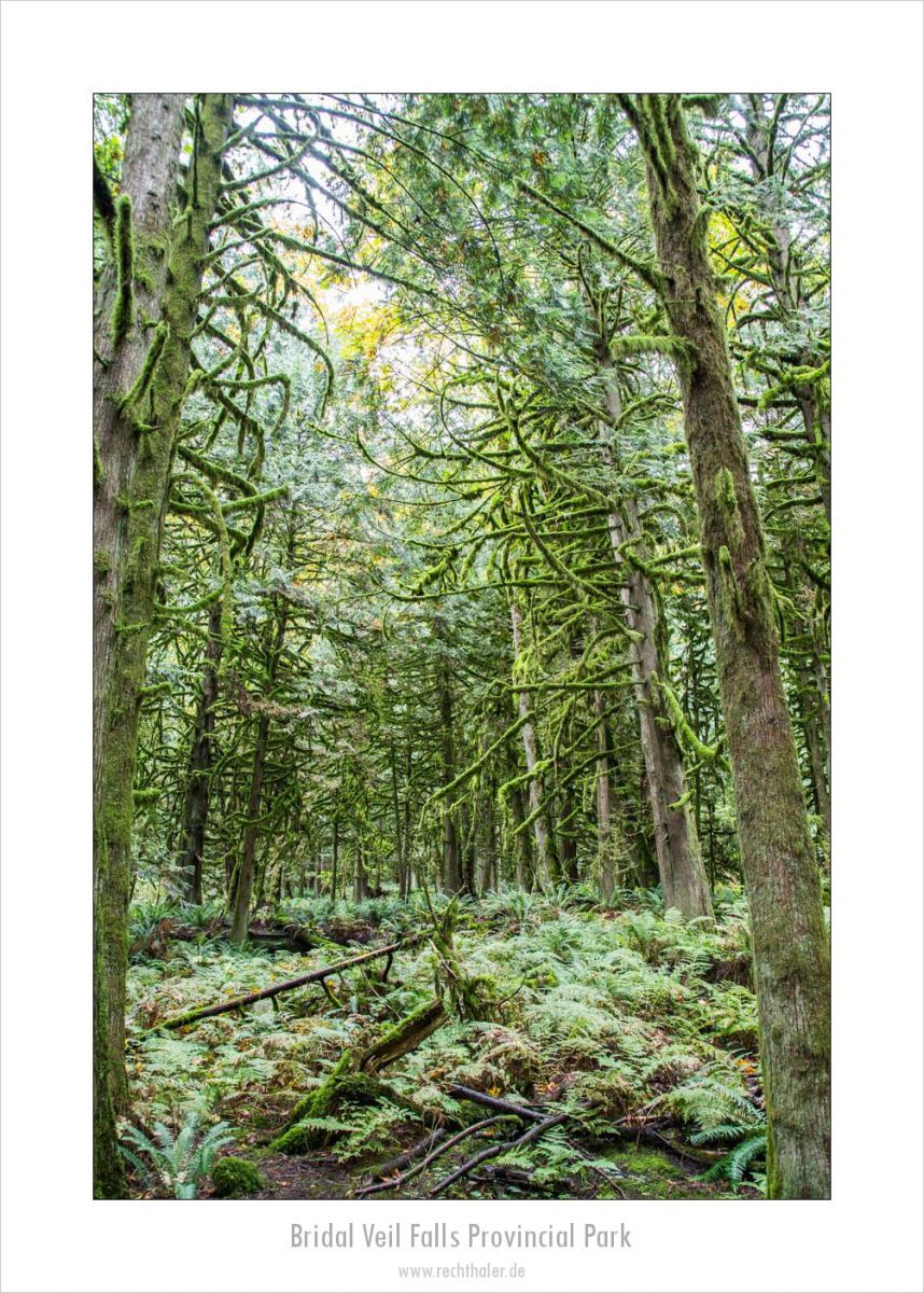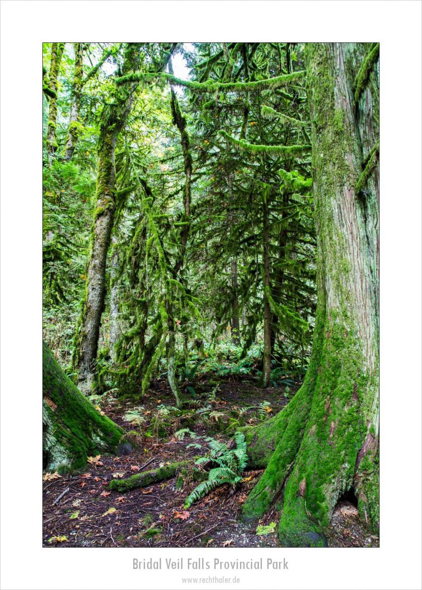 Beleidigt sind wir weiter gefahren und haben auf den restlichen Rambo-Gedächtnis-Stadtspaziergang verzichtet. Kurz nach dem Verlassen von Hope gibt es einen Wasserfall, die Bridal Veil Falls. Der Wasserfall an sich ist nicht besonders spektakulär, aber rund um den Parkplatz stehen ganz viele schöne moosbewachsene Bäume, die viele schöne Fotomotive abgeben. Allerdings sollte man hier etwas aufpassen. Es weisen zahlreiche Schilder auf Autodiebstahl hin.