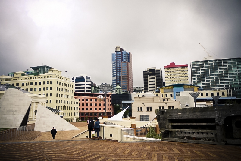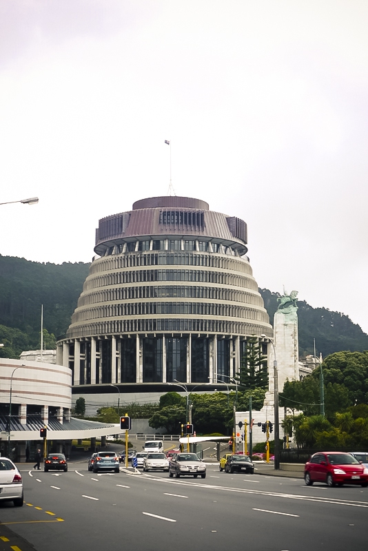 Der Tag begann mit einem leckeren Frühstück (im Preis inbegriffen). Es gab Rührei und Speck, Hashbrowns mit Pilzsoße, Würstchen und noch mehr. Freilich gab es auch so gesundes Zeugs wie Früchte und Jogurt, aber bei dem vielen Rührei und Speck war da einfach kein Platz mehr. Anschließend gings zum Stadtspaziergang, der bei etwas bedecktem Himmel und starkem Wind keinen wirklichen Spaß gemacht hat. Trotzdem sind wir eisern die vom Lonely Planet vorgeschlagene Route abgelaufen und haben uns die Sehenswürdigkeiten von Wellington angesehen. Viel gibt es eigentlich nicht, außer dem Parlament und einem angeschlossenen Verwaltungsgebäude, das wir ein großer Bienenstock aussieht schaut man sich hauptsächlich Gebäude in der Innenstadt an, in denen eine Vielzahl an Läden untergebracht ist.