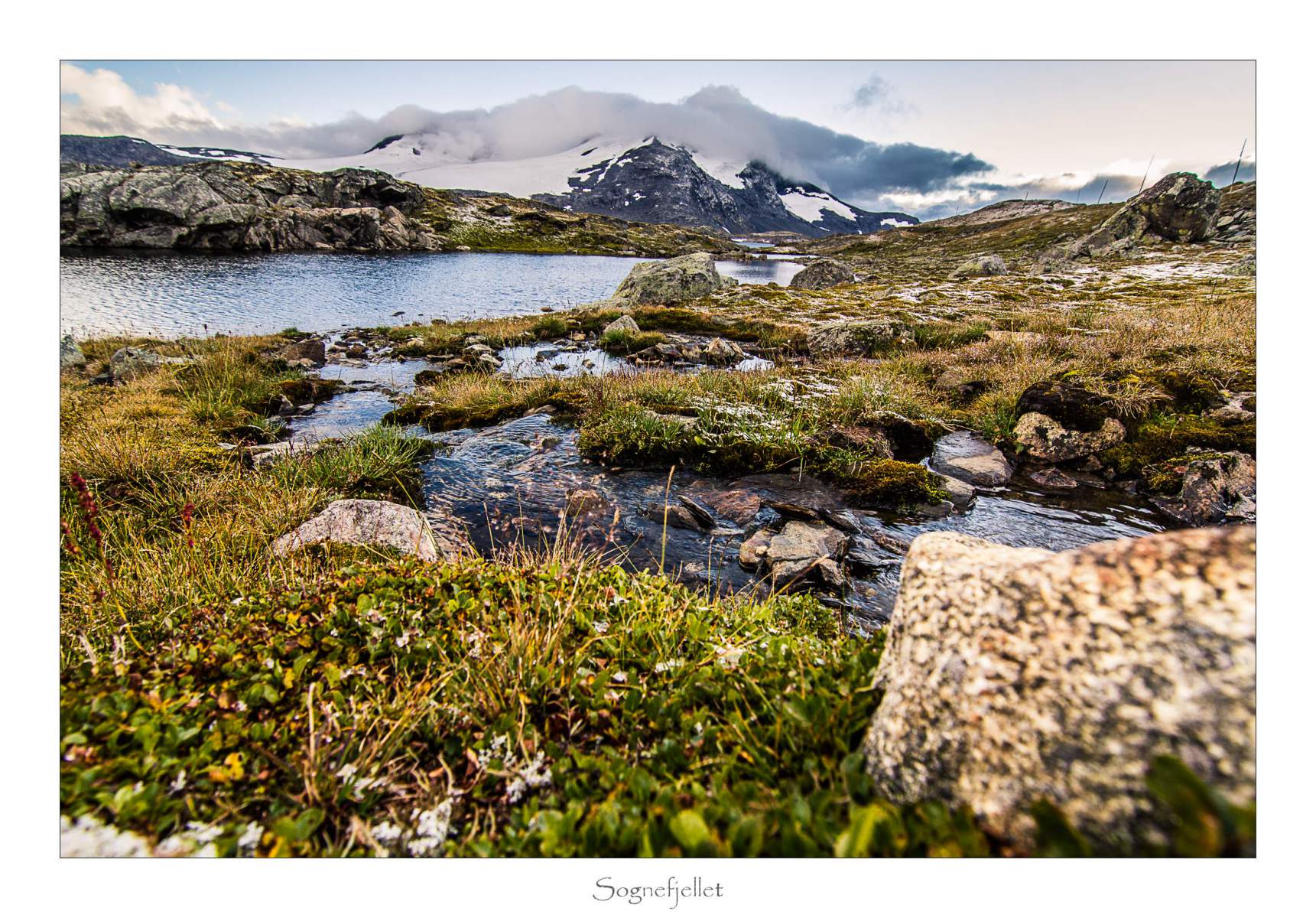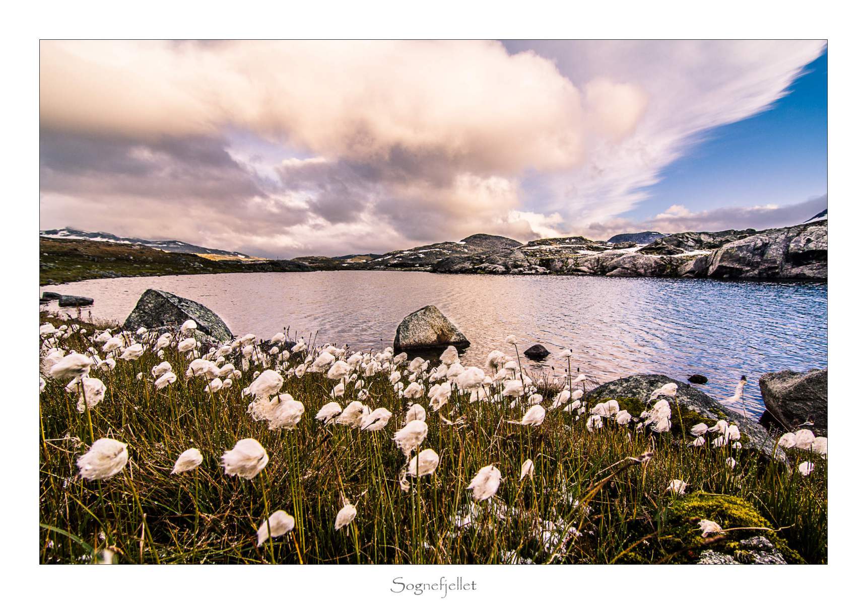 Pünktlich zur tiefstehenden Sonne am späten Nachmittag erreichten wir das Sognefjellet, eine weitere Hochebene auf der R55 zwischen Graupne und Lom. Durch das fantastische Licht ergaben sich hier jede Menge tolle Fotomotive vom Panorama der schneebedeckten Berggipfel bis zur Wildblume im leuchtenden Abendrot. Wir waren begeistert von der Landschaft und haben daher beschlossen, hier oben einen Platz zum Übernachten zu suchen. Eine gute Gelegenheit bot uns der Rastplatz Mefjellet, der mit einer bekannten Kunstskulptur jede Menge Touristen zum Anhalten bringt. Es war jedoch recht ruhig an dem Tag und so konnten wir ungestört einen schönen Abend verbringen, der gegen später noch recht kalt wurde. Immerhin befinden wir uns hier auch in fast 1400 Meter Höhe, sodass es kein Zufall war dass wir am selben Abend noch in einem kräftigen Schneesturm ziemlich gefroren haben. Zum Glück hatte unser Womo aber eine tolle Standheizung. Durch den Neuschnee und die Wetterlage haben sich weitere tolle Fotomotive aufgetan.