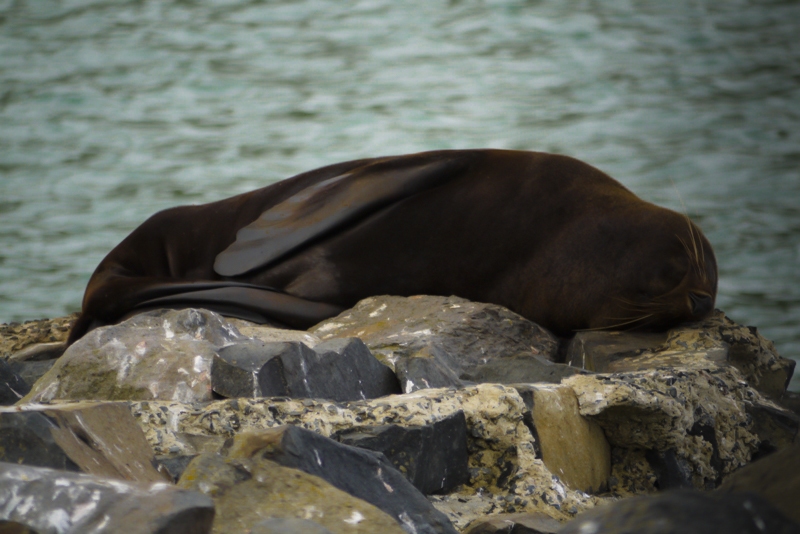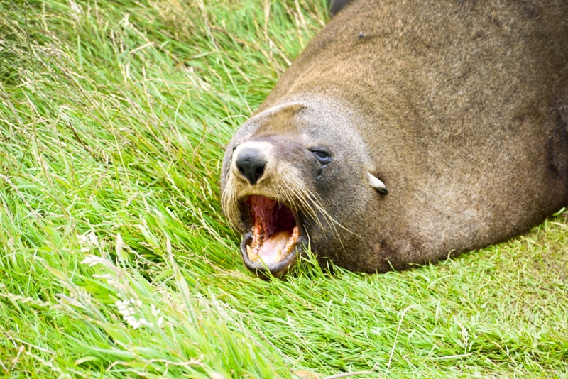 Der nächste Tag begann früh. Gegen 6.30 Uhr waren wir beide wach und ich wollte einfach nur wegfahren. Darum haben wir uns auf den Weg gemacht, um eine nahe gelegene Albatross-Kolonie aufzusuchen. Dort gab es auch ein Visitorcenter, das natürlich um diese Zeit noch geschlossen war. Also haben wir uns die Zeit damit vertrieben an einem kühlen Morgen an der Küste zu stehen und uns mit den Möwen um unsere letzten Muffins zu streiten. Die waren so frech, die sind direkt auf dem Auto gelandet als wir ankamen.
